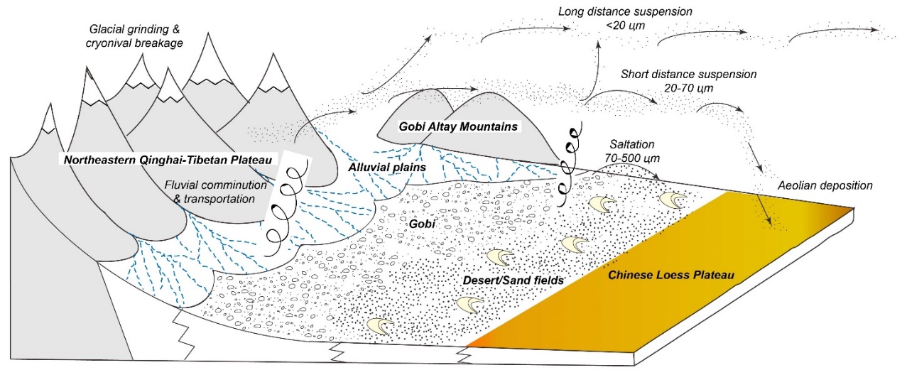 图1. 黄土高原的位置及其与潜在的物源区的联系。其中,橙黄色区域是黄土堆积区。