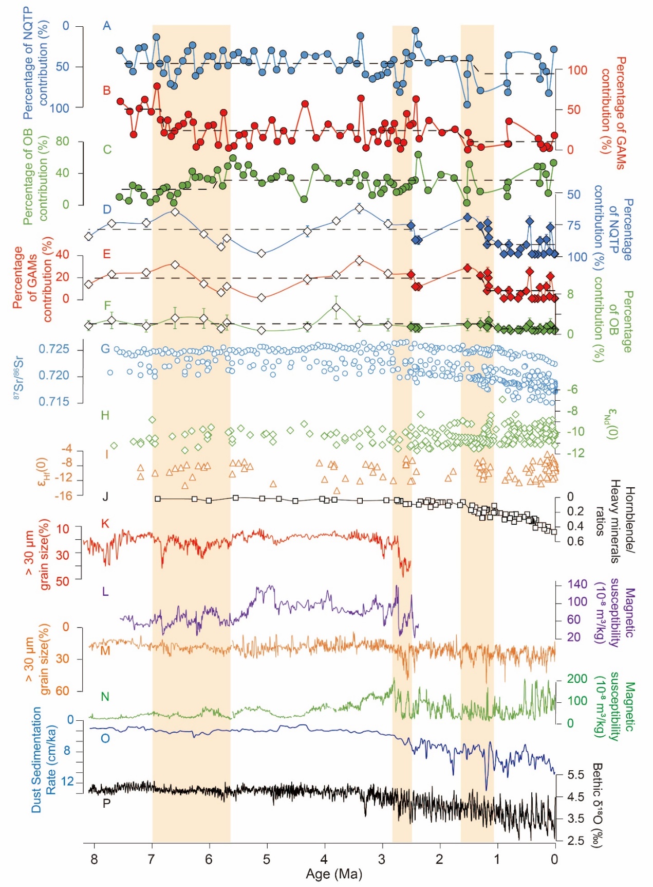 图2. 约800万年以来黄土高原沉积物锆石年龄谱变化指示的物源变化及与全球温度、海平面、亚洲季风气候变化的联系。