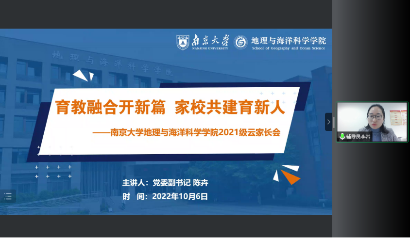 为进一步深入贯彻“育教融合,家校共建”的教育理念,促进学校家庭共同携手,构建和谐的家校育人共同体,大渔直播 于10月6日上午召开了“育教融合开新篇 家校共建育新人”——大渔直播 2021级云家长会。学院党委副书记陈卉老师、副院长金晓斌老师、本科生辅导员李岩老师以及2021级学生家长50余人共同参加了本次线上会议,会议由辅导员李岩主持。