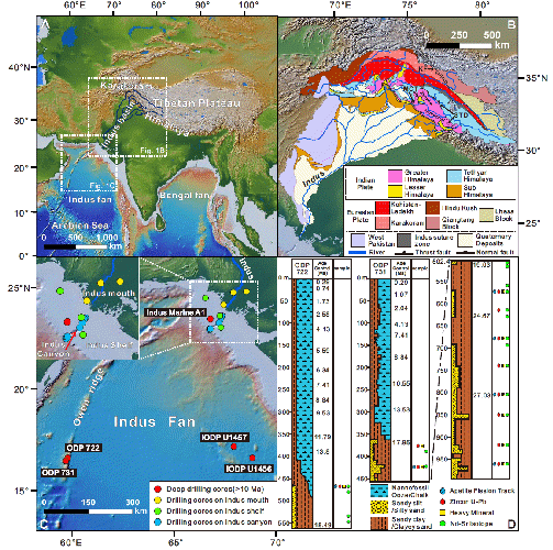 亚洲南部高耸的喜马拉雅-喀喇昆仑山及其南边深陷的阿拉伯海-孟加拉湾,组成了地球表层高程差最大的地形地貌。特殊的地形地貌影响着大气环流型式和大江大河发育,孕育了独有的亚洲季风气候和河流水系格局。长期以来,关于喜马拉雅-喀喇昆仑山脉生长与阿拉伯海-孟加拉湾的形成,吸引着国内外诸多科学家,并取得不少研究进展。然而,关于喜马拉雅-喀喇昆仑山系隆升、印度河演变、阿拉伯海沉积以及季风气候变化等重要科学问题,没有获得一致认识,亚洲南部地貌起源与演变还有诸多不解之谜。最近,大渔直播 鹿化煜教授课题组结合在阿拉伯海大洋钻探(ODP)获得的宝贵样品,研究喜马拉雅-喀喇昆仑山与阿拉伯海演变过程,发表了以大渔直播 博士生冯晗同学为第一作者的论文“Erosion of the Himalaya-Karakoram recorded by Indus Fan deposits since the Oligocene”, 揭示了亚洲南部山脉-流域的起源和演化,揭示了喜马拉雅-喀喇昆仑山和阿拉伯海体系演变过程,受到同行专家的高度肯定。