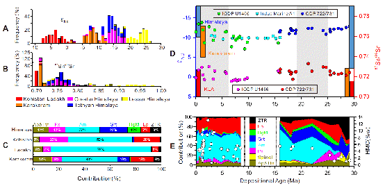 图2. 深海沉积物样品的钕(2A)和锶(2B)同位素分布、重矿物组合(2C)以及钕、锶同位素(2D)和重矿物组合(2E)随时间变化序列。