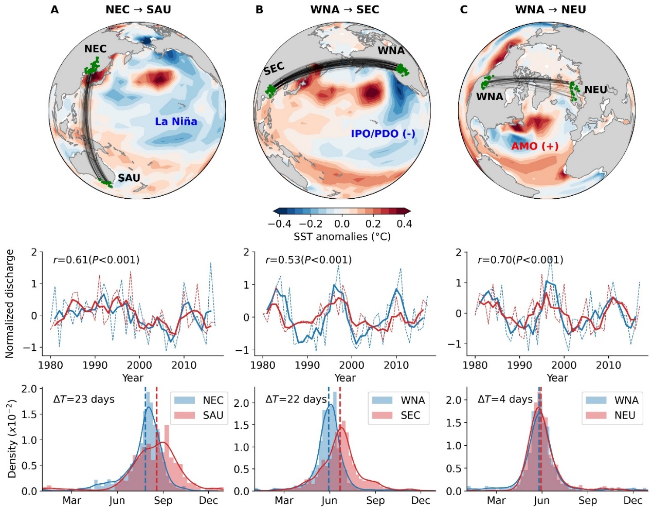图3 降雨-降雨(A),降雨-融雪(B),融雪-融雪(C)三类洪水远程同步热点地区(散点和连线),及其同步时的海温异常模态(第一行),洪峰流量时间序列(第二行)和洪峰出现时间概率密度分布(第三行)