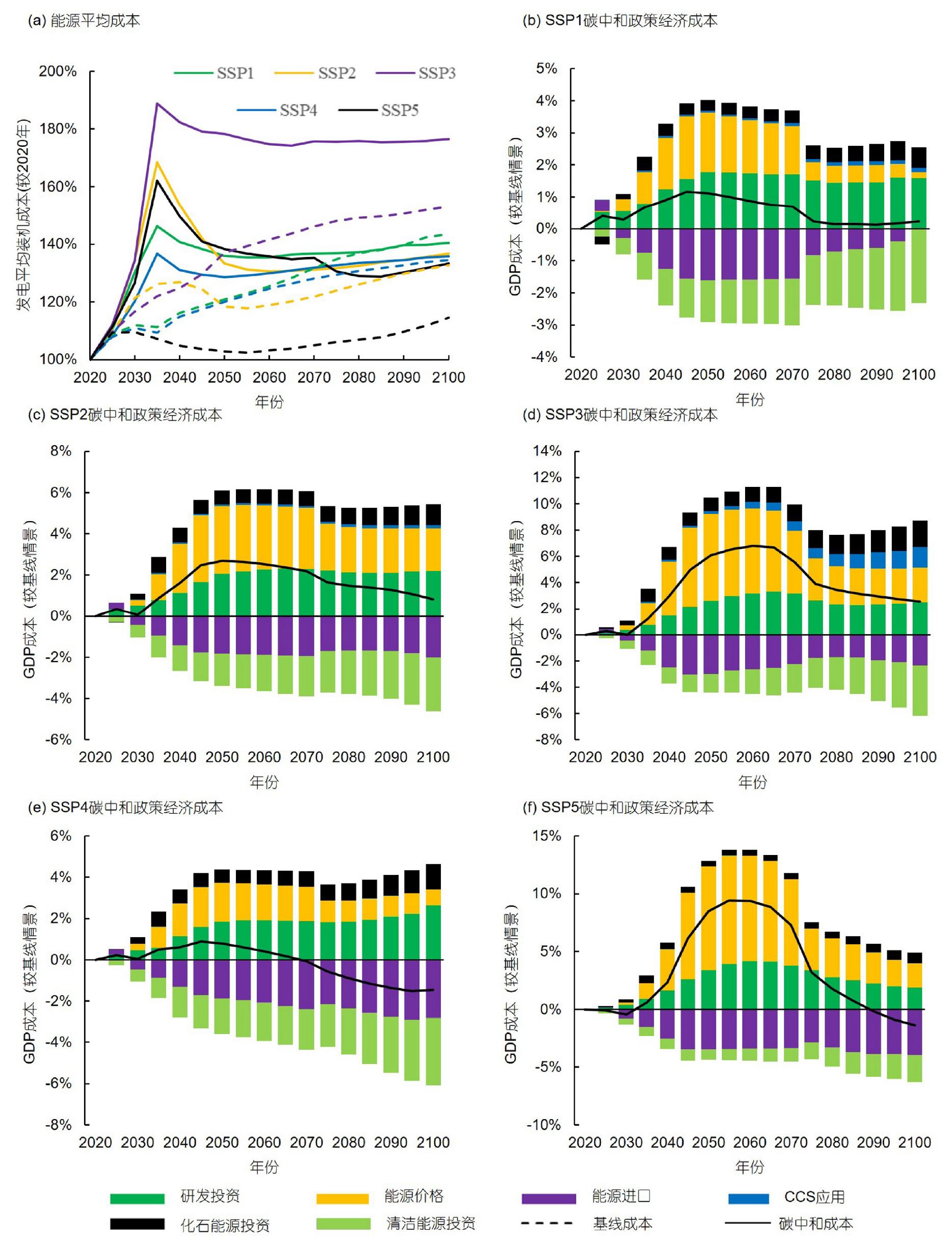 (a) 使用平均装机成本表征的能源成本; (b-f) 不同共享社会经济路径下由于碳减排政策导致的经济成本
