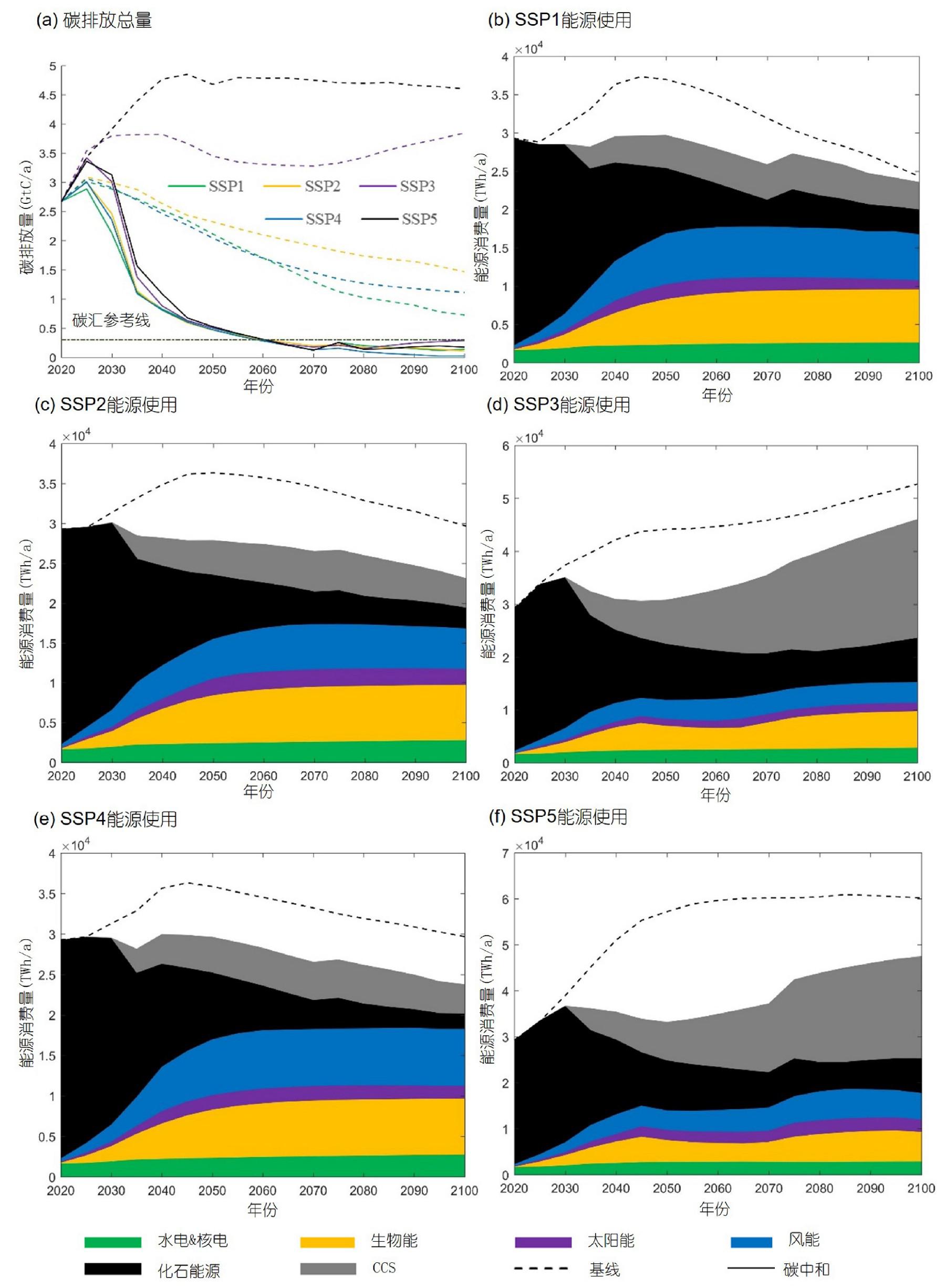 图1 共享社会经济路径下2020-2100年中国能源使用与碳排放预测