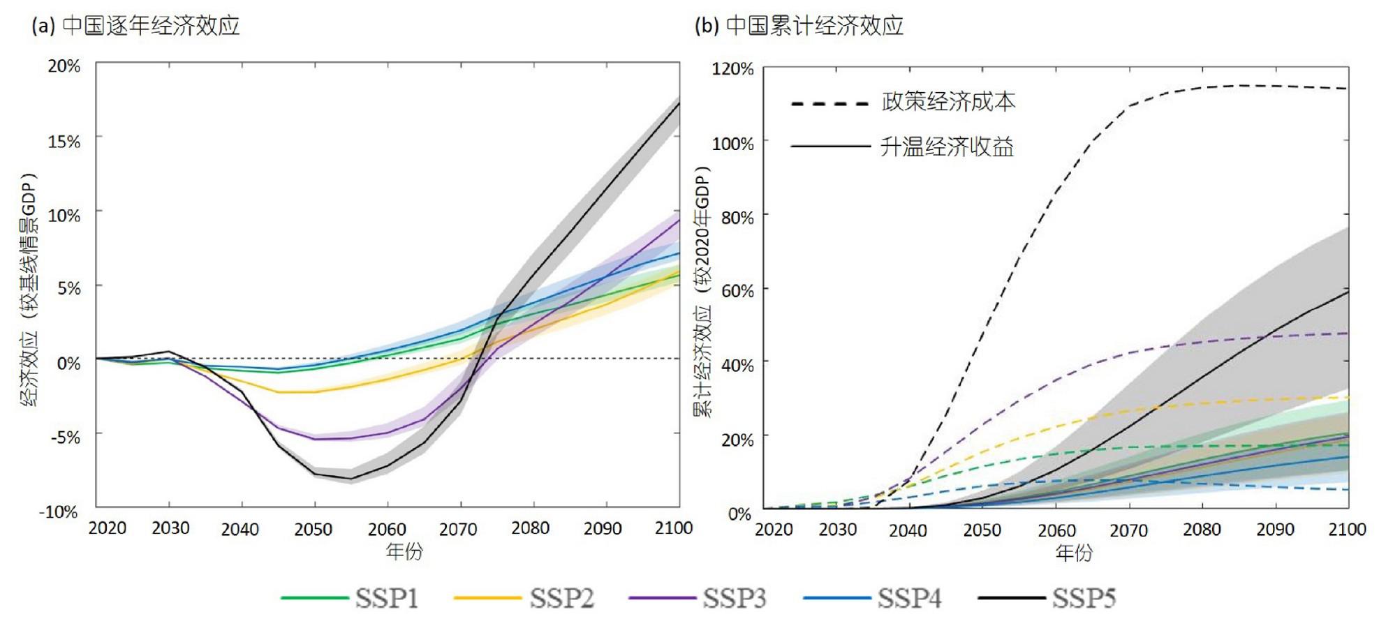 (a) 各个SSP路径下中国年均温降低的幅度; (b) 各个SSP路径下中国降低温度所产生的经济收益. 两图中阴影为基于温度不确定性的95%置信区间