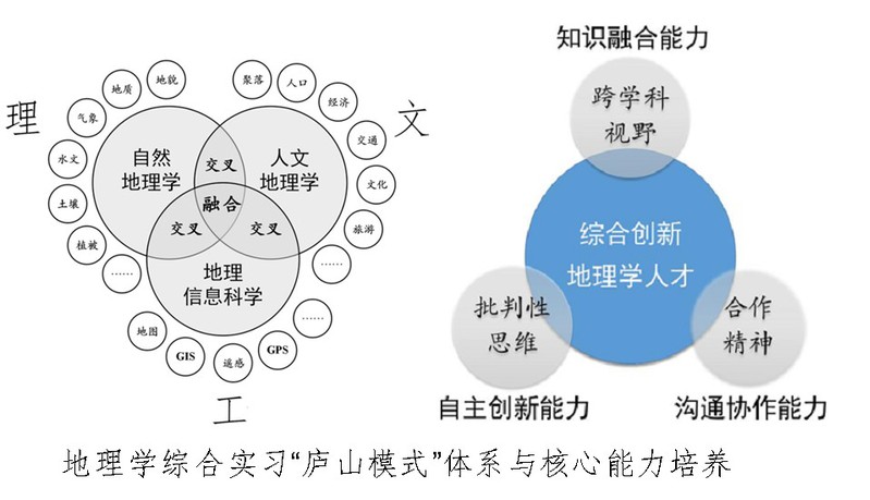 庐山模式”坚持以“地理学全学科深度融合” 为教学理念,以“人地关系”为主线,在庐山这一“世界文化景观”与“世界地质公园”的独特平台上,有机整合地貌、土壤、气象、水文、植被等自然要素,以及人口、经济、文化、城镇、旅游等人文要素,融合遥感与地理信息技术,开展数字地形建模、空间分析与专题制图等,形成了“大地理”教学内容体系,全面提升学生知识融合、自主创新与沟通协作三项核心能力。