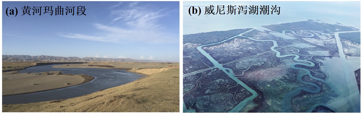 唐代诗人刘禹锡的组诗作品《浪淘沙九首》“九曲黄河万里沙,浪淘风簸自天涯。如今直上银河去,同到牵牛织女家”以豪迈且浪漫的手法写出了黄河的曲折和气势磅礴,形象地描绘了黄河弯弯曲曲的典型地貌特征。冲积平原地区的河曲或沟曲(meanders,下文称河曲)地貌与人们的生存生活息息相关,一直以来是地质学家关注的重点。河曲的自由摆动会对人们的居住环境造成威胁,人们也会对河曲进行裁弯取直、疏浚加深等渠道化改造工程。在沿海的潮间带也广泛发育着由潮流所塑造的潮沟河曲(tidal meanders,图1)地貌,其平面形态特征与内陆冲积平原上的弯曲河流类似。潮沟不仅是潮间带与外海的物质交换活动通道,也为沿海湿地生物的繁殖和幼体的成长提供了保护场所,在维持海岸生物多样性方面有重要作用。