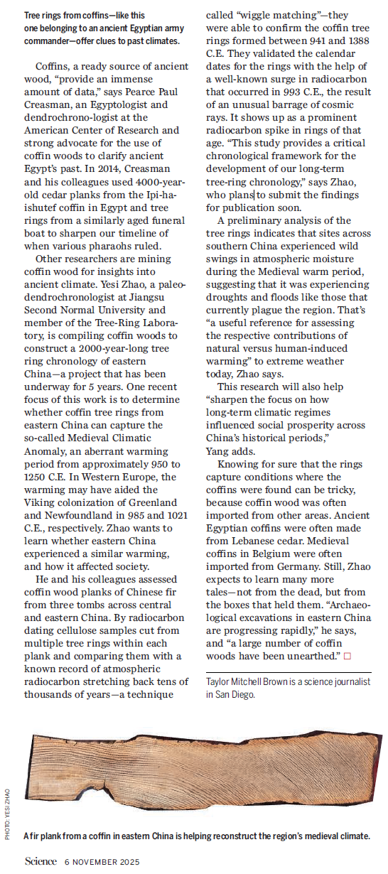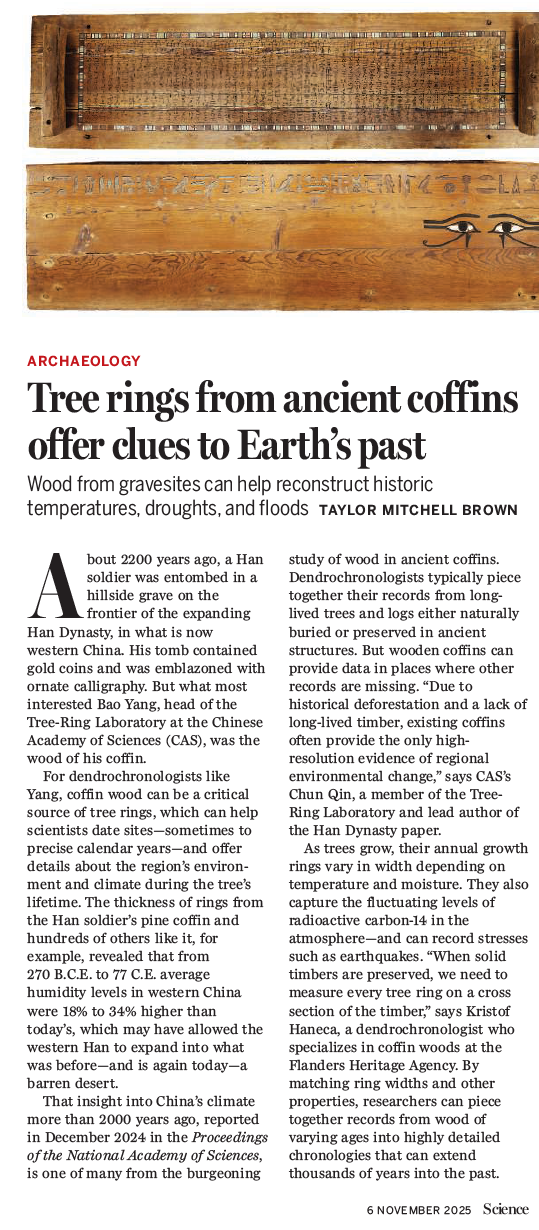 近日,大渔直播 杨保教授团队的研究成果获得国际权威学术期刊《科学》(Science)新闻版块(News)关注,并以《古代棺木年轮为洞悉地球过去提供线索》(“Tree rings from ancient coffins offer clues to Earth’s past”)为题进行专题报道。