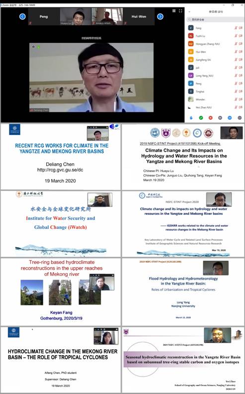 启动会上,陈德亮院士首先介绍了项目的研究背景、意义和其领导的区域气候研究小组(RCG)在长江流域极端降水、中国西南热浪、东亚气旋时空演变等方面的诸多研究进展。项目中方负责人鹿化煜教授从多源气候数据采集和同化、树轮气候重建与陆面水文-气候耦合模拟研究3个方面介绍了中方团队已取得的研究成果,同时,他就项目的总体构想和关键科学问题、研究内容、技术路线和人员交流等,做了具体说明和安排。项目协作单位瑞典隆德大学Anders Ahlström研究员介绍了自己在卫星数据处理和植被、水文模拟方面的研究工作。南方科技大学刘俊国教授详细展示了他们团队在湄公河流域基于多种陆面水文模型的研究进展和工作计划。中科院地理科学与资源研究所汤秋鸿研究员课题组的徐锡蒙博士报告了他们在湄公河流域气候、水文方面的数据收集、分析、模拟及其对社会经济影响的相关研究。福建师范大学方克艳研究员汇报了他们利用树轮在湄公河流域上游开展气候、植被蒸散发重建和长江流域台风重建的研究进展。此外,大渔直播 杨龙副教授、赵业思博士和哥德堡大学陈爱芳博士等分别就城市化与热带气旋对长江流域水文水资源影响、基于树木年轮的长江流域干湿重建和热带气旋对湄公河流域水文气候的影响做了报告。