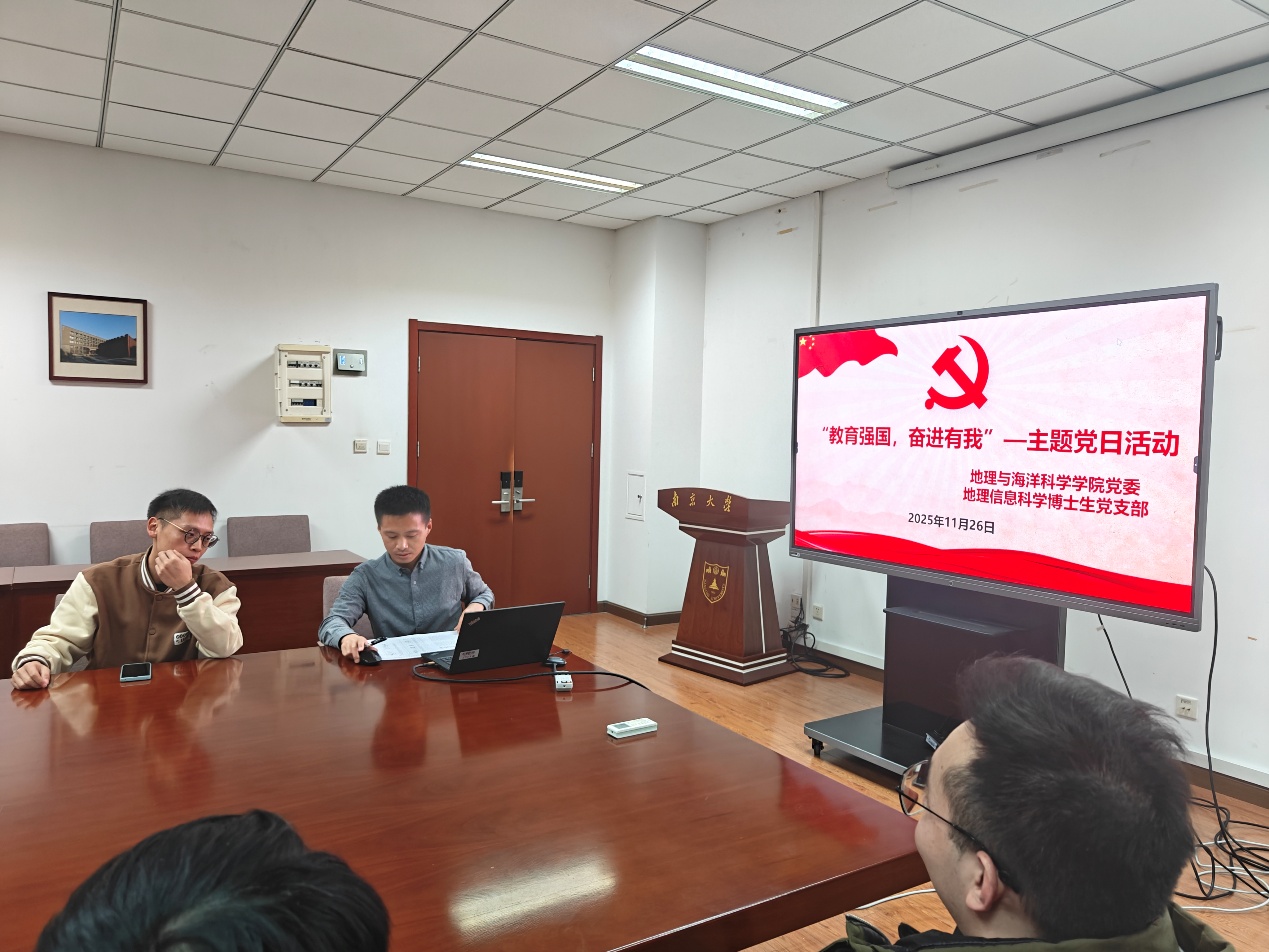 2025年11月26日,中共大渔直播 地理信息科学博士生党支部举办“教育强国,奋进有我”主题党日活动。本次活动以深入学习贯彻习近平新时代中国特色社会主义思想为主线,紧密围绕党的二十大及二十届四中全会精神,结合地理信息科学、遥感科学等学科特色,引导青年博士生党员坚定理想信念、恪守科研诚信、服务国家战略。