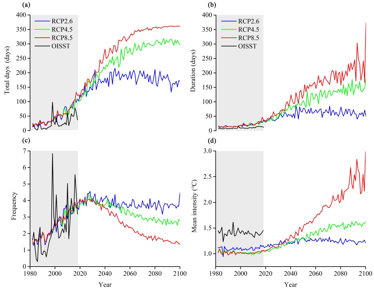 图3 未来不同增温情景下海洋热浪时间变化特征