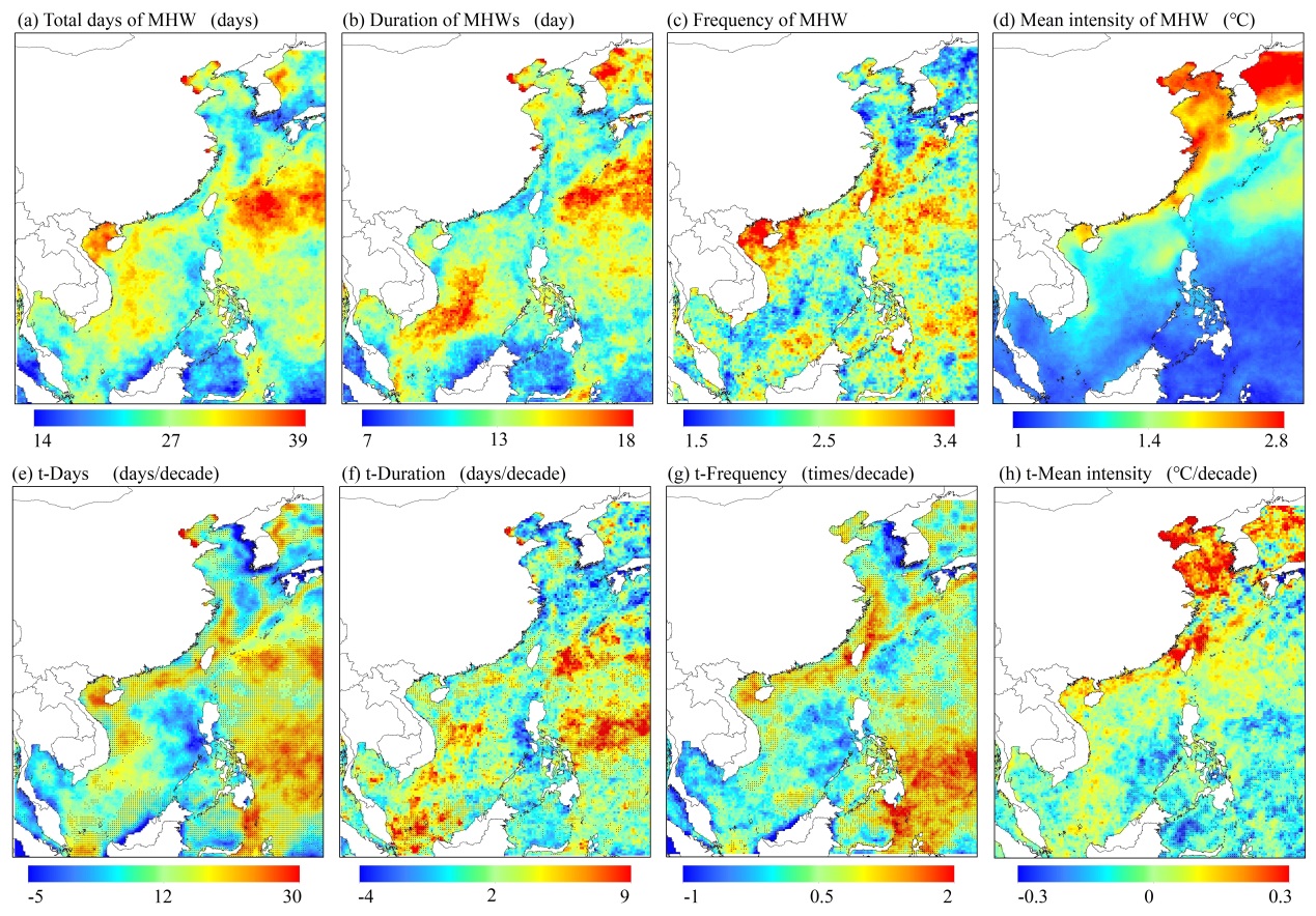 海洋是全球气候的重要控制器和调节器。海洋吸收了全球变暖增加能量的90%以上,并存储在700米以上海洋中。中国近海,尤其是东海海域,是海表增暖的热点区域,增温速率超过全球平均值。近年来,海洋热浪在全球海域内被不断报道,对海洋生态环境造成了严重影响,但对中国近海热浪研究相对缺乏。该研究基于高分辨率海表温度数据,结合CMIP5海洋模式数据对中国近海1982-2018年及未来海洋热浪变化情况进行了研究,并得出以下主要结论:(1)中国近海海洋热浪主要集中在渤海、南海北部湾、日本海和台湾岛以东洋面(图1)。(2)渤海内三大海湾海洋热浪严重,对当地渔业养殖、有害藻华爆发和海洋牧场建设带来潜在风险(图2)。(3)2040年是中国近海未来不同变暖情景下海洋热浪变化的关键节点(图3)。