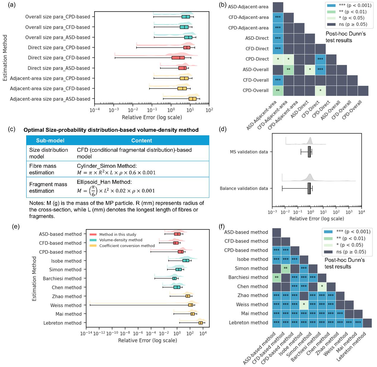 该研究基于微塑料粒径分布与质量之间的内在统计关系,提出将粒径分布模型与体积–密度估算方法相结合,通过“粒径分布模型选择—区间颗粒数计算—区间质量估算—总质量汇总”四个步骤,构建了一套兼顾准确性与可操作性的质量估算流程。研究系统比较了三类粒径分布模型及多种体积几何假设,结果表明:条件碎片模型(Conditional Fragmentation Distribution, CFD-based model)结合 Simon 圆柱体纤维模型与 Han 椭球体碎片模型在所有模型中表现最好,并显著优于传统平均质量换算方法,其误差与体积密度估算法相当。在方法验证方面,研究整合了来自天平称量与质谱分析的多源实测数据,对新方法进行了系统评估。结果显示,该方法在不同介质(水体、沉积物和大气样品)中均具有良好的稳定性和可迁移性。
