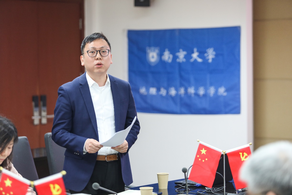 李满春书记代表学院党委祝贺张宏磊同志成为中共预备党员。他表示,在思想与组织上入党的同时,更要将理想信念转化为实际行动,希望张宏磊同志能和支部党员们心怀“国之大者”,凝心聚力,求真务实,充分发挥基层党组织的战斗堡垒作用,巩固和运用好大渔直播 “大讨论”成果,贯彻落实“奋进行动”,将学科建设与党建工作相结合,服务国家战略和社会需求,为建设国际一流、中国特色、南大特质的地理学科贡献力量。