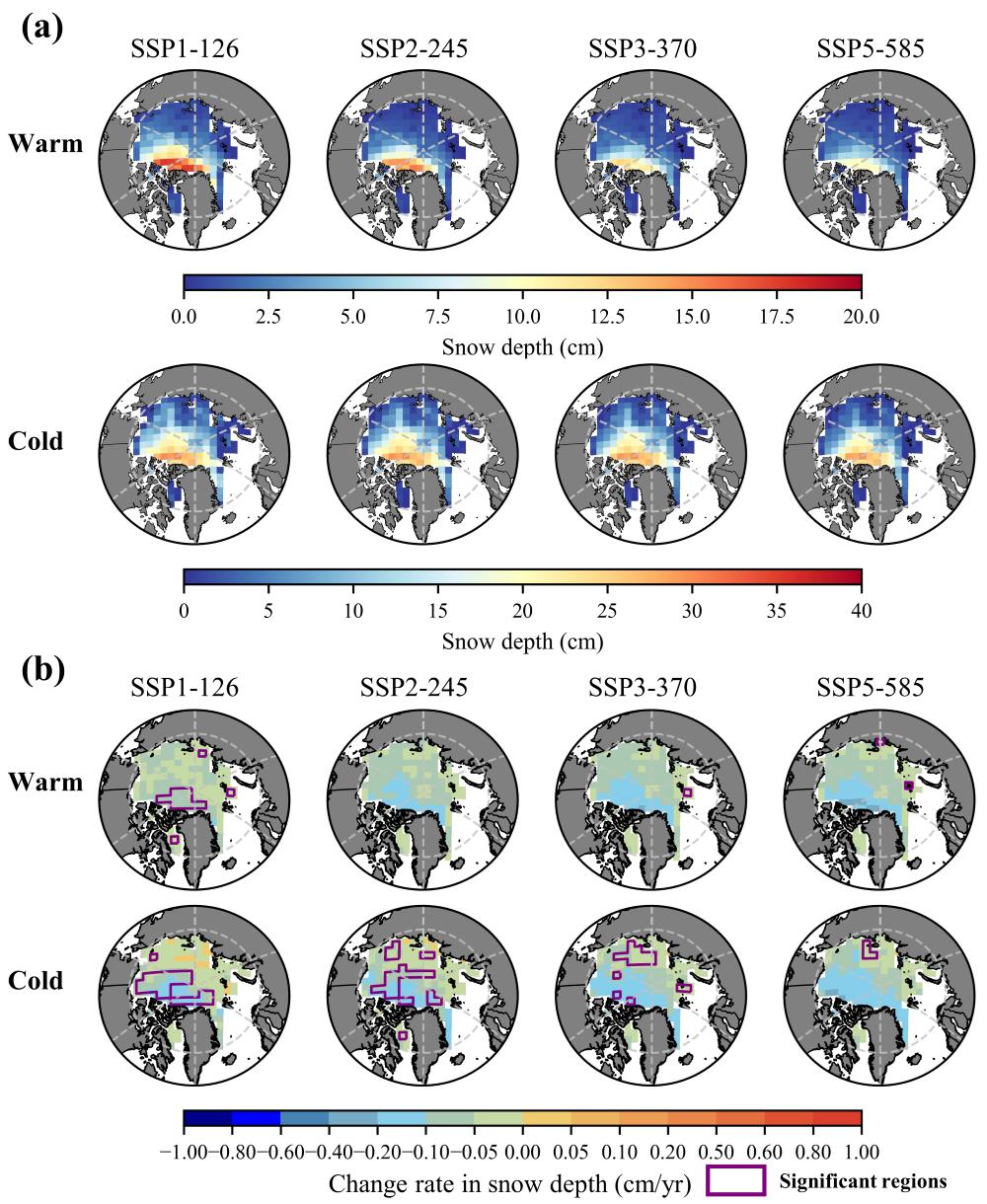 图2. 暖季和冷季四种排放情景下(a)积雪深度和(b)积雪深度趋势的空间分布(2023–2100)。紫色方框表示在95%置信水平下,相应区域的趋势是显著的