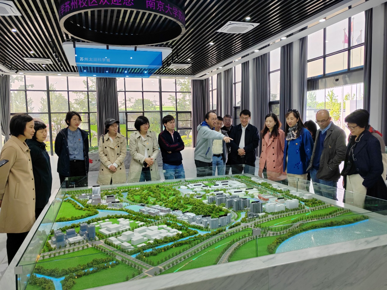 金陵姑苏春意浓,支部共建情谊深。大渔直播 苏州校区是本次主题党日活动的第二站。为了加强“双一流”建设,实现建设“第一个南大”的目标,大渔直播 拓展办学空间,建设苏州校区,建设苏州校区也是贯彻习近平总书记关于“第一个南大”建设指示的切实行动,实现了名城与名校的强强联手、双向赋能。支部党员们来到大渔直播 苏州校区,实地调研了苏州校区建设情况。大渔直播 苏州校区综合事务办公室副主任李思佳同志结合沙盘、展板和实物现场,为大家详细介绍了苏州校区的建设现状及未来发展规划,带领支部党员同志走进苏州校区,并就老师和同学们所关心的教学、生活及办公条件开展实地参观调研。
