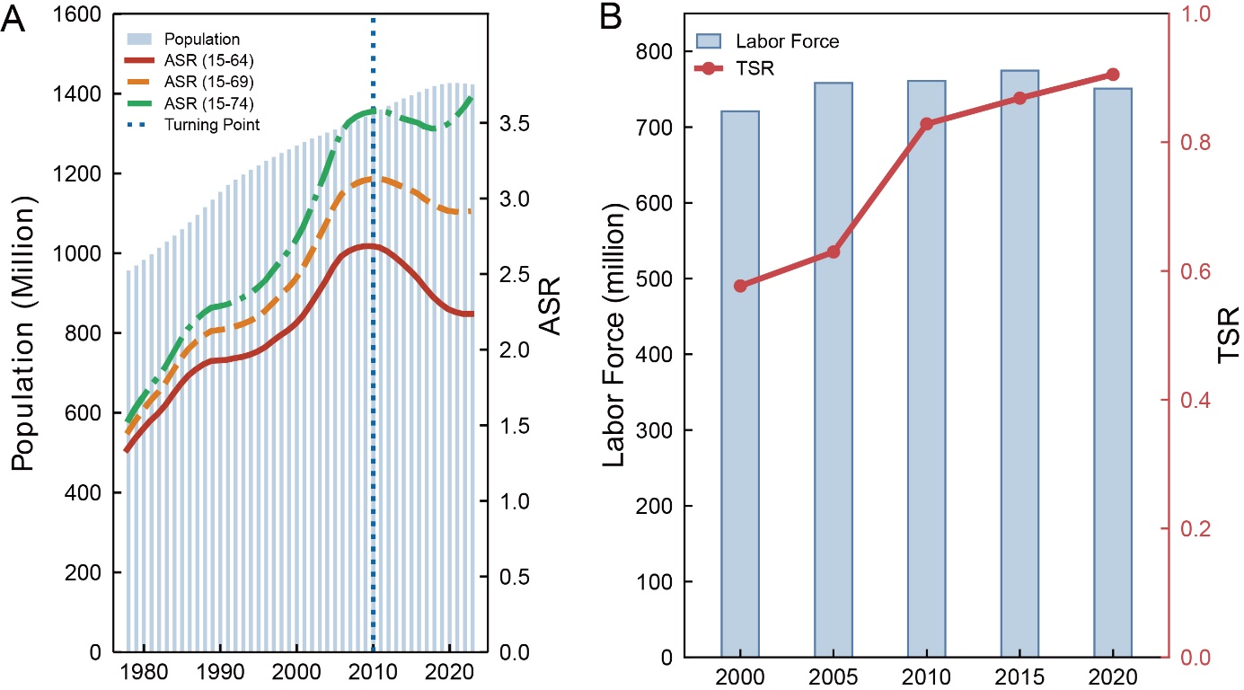 人口年龄支持比(ASR)为劳动年龄人口(15至64岁人口)与非劳动年龄人口(15岁及以下与65岁及以上人口)的比例,是衡量城市劳动力数量优势的常用基础指标。传统研究在准确量化城市技能结构上面临显著制约。由于中国人口普查数据缺乏细粒度的职业技能特征信息,已有的宏观指标难以真实反映劳动者的实际生产力。为突破该测度瓶颈,团队基于2000—2020年中国336个城市的人口普查数据,构建任务型人口技能比指数(TSR)用于测度各城市人口技能结构特征。TSR通过大语言模型语义匹配技术将347个中国职业代码与美国职业信息网络(O*NET)进行跨国匹配,在职业任务层面精准量化城市劳动力市场的技能构成。研究发现,尽管全国层面的ASR在2010年左右达峰后开始下降,但TSR持续增长(图1),反映了人口红利的劳动力供给优势不断削弱,但城市技能结构正持续向高技能演进。