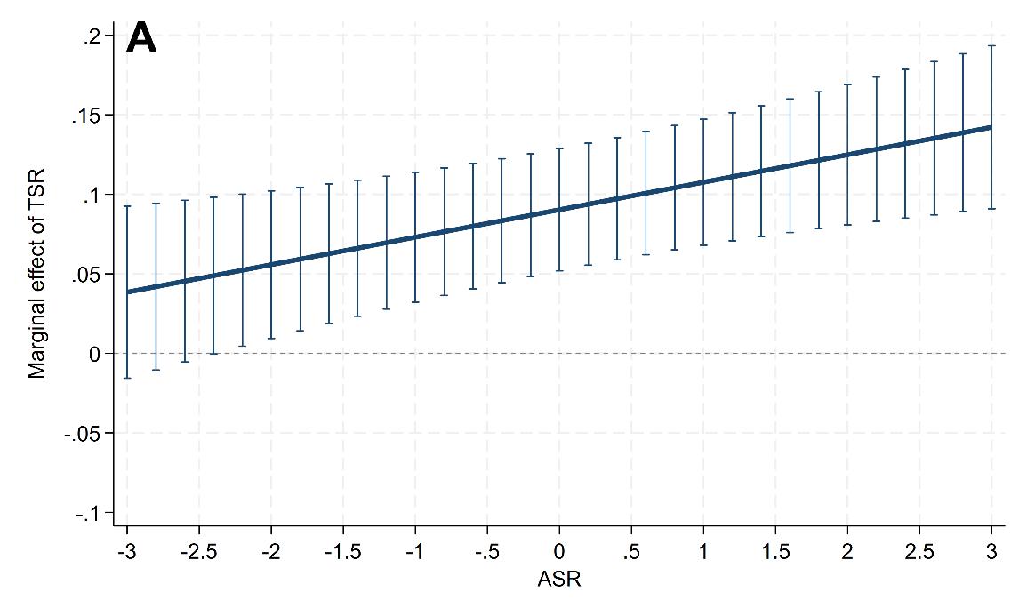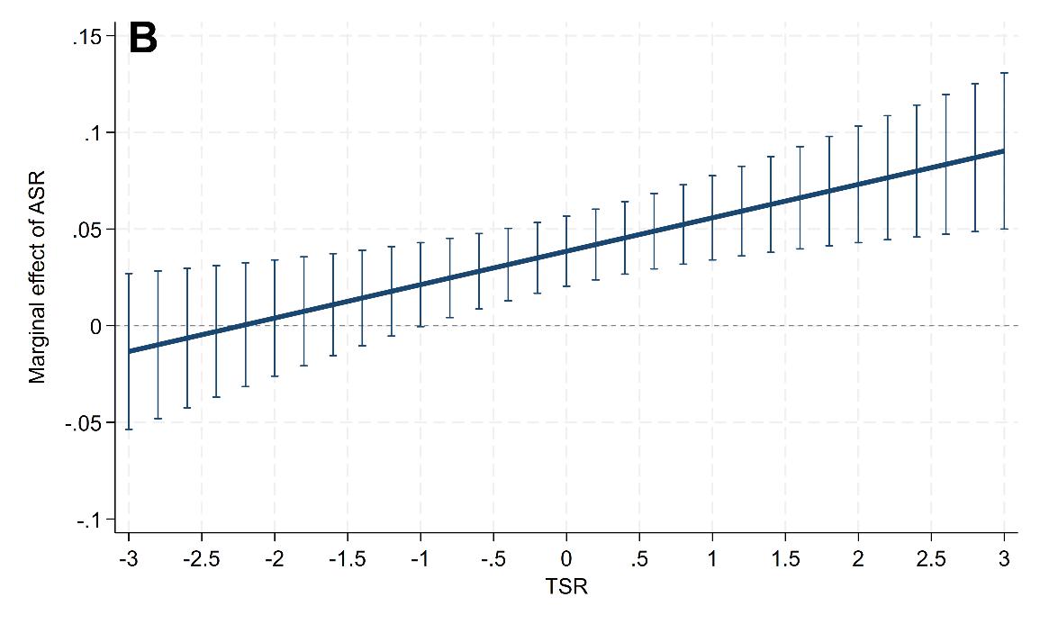 ASR与TSR对经济增长均具有显著的促进作用,且两者之间存在协同效应。然而,这种协同效应的发挥需要一定的门槛限制,即充分的技能积累是释放传统人口红利的先决条件(图2)。这意味着在劳动力技能处于较低水平的城市,单纯的人口年龄结构改善难以直接转化为经济增长动能。因此,优化人口技能结构并实现人力资本升级,是激活人口红利的核心路径。
