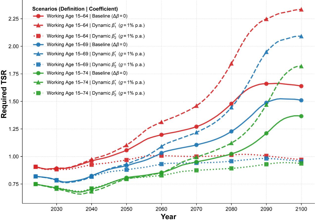 最后,研究团队基于联合国的低生育率(Low variant)方案,构建了2025—2100年应对ASR变化的人才红利预测模型。结果表明,延迟退休能够短期扩大劳动力供给,预期在2030—2040年之间创造出人口结构调整窗口期。然而,单纯调整劳动力供给仅能提供暂时的缓冲,实现TSR的持续增长是有效推动经济繁荣的根本举措(图4)。