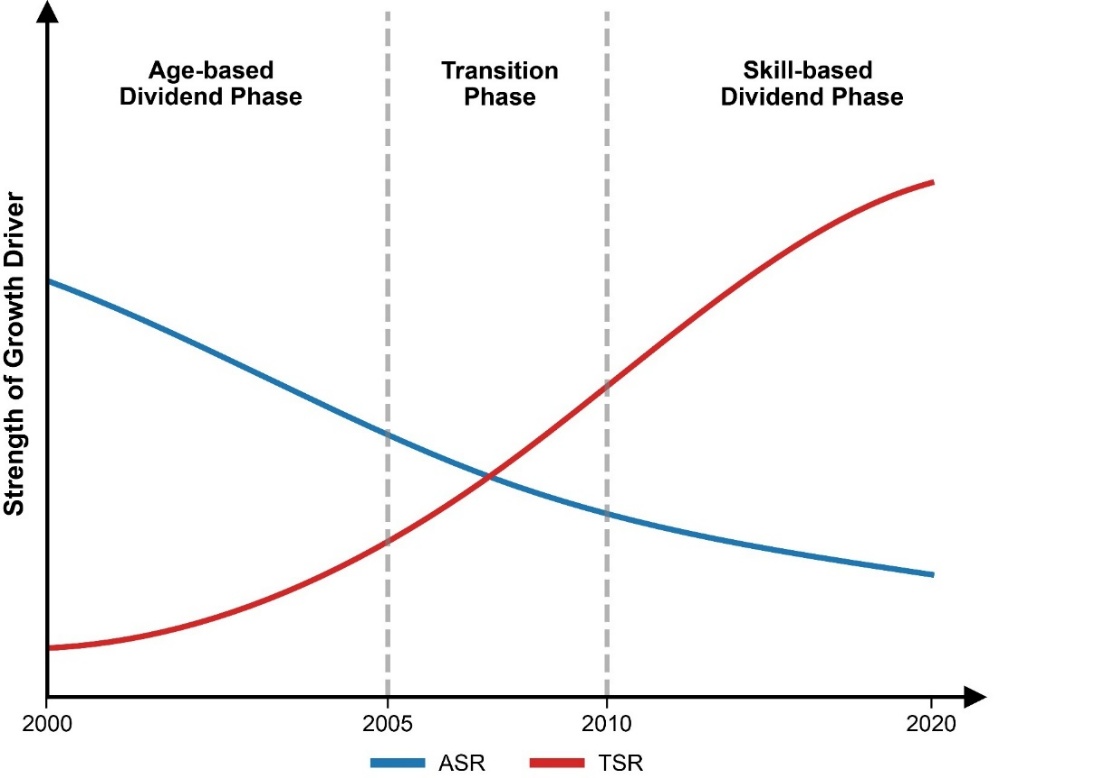 中国经济增长的人口驱动力经历了三个阶段的演变(图3)。(1)人口红利阶段(2000—2005年):该阶段的典型特征是劳动年龄人口扩张成为驱动经济快速增长的主要动力,市场化改革与户籍限制的放宽促进了劳动力从农业向工业部门的大规模转移,使得中国能够充分发挥其年龄结构优势;(2)红利转型阶段(2005—2010年):ASR的贡献开始下降,而TSR的影响力不断上升,两者开始呈现趋同态势;(3)人才红利阶段(2010年之后):经济增长的驱动力发生了根本转变,随着ASR的边际经济效应持续减弱,产业升级与人力资本提升促使TSR演变为经济增长的主导来源。