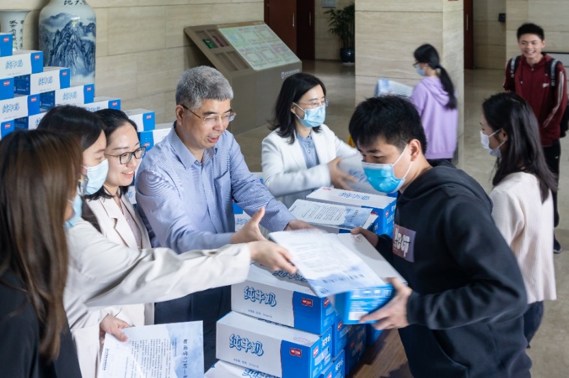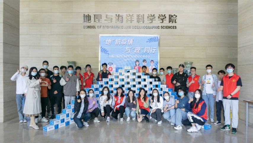 为保障在校学生的生活和防疫需要,鼓励学院师生在疫情期间进一步凝心聚力、共克时艰, 4月22日,地理学院精心部署,开展同心抗疫慰问活动,学院党委书记李满春、党委副书记陈卉和团委书记李岩、辅导员郦天昳于昆山楼一楼大厅向学生发放牛奶等物资。三十余位研究生志愿者集结、搬运和陈列物资,展现出同心协力的精神和力量。