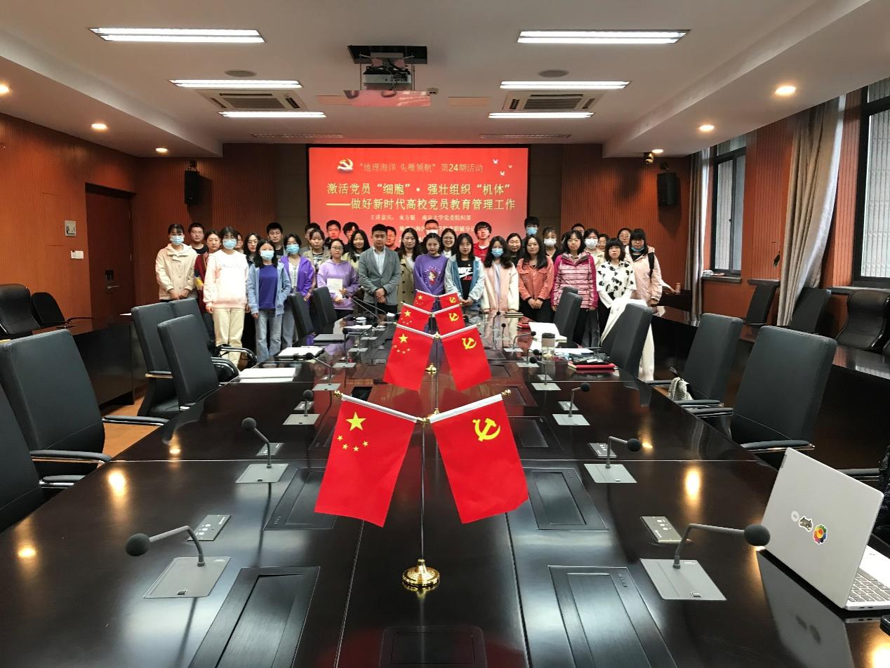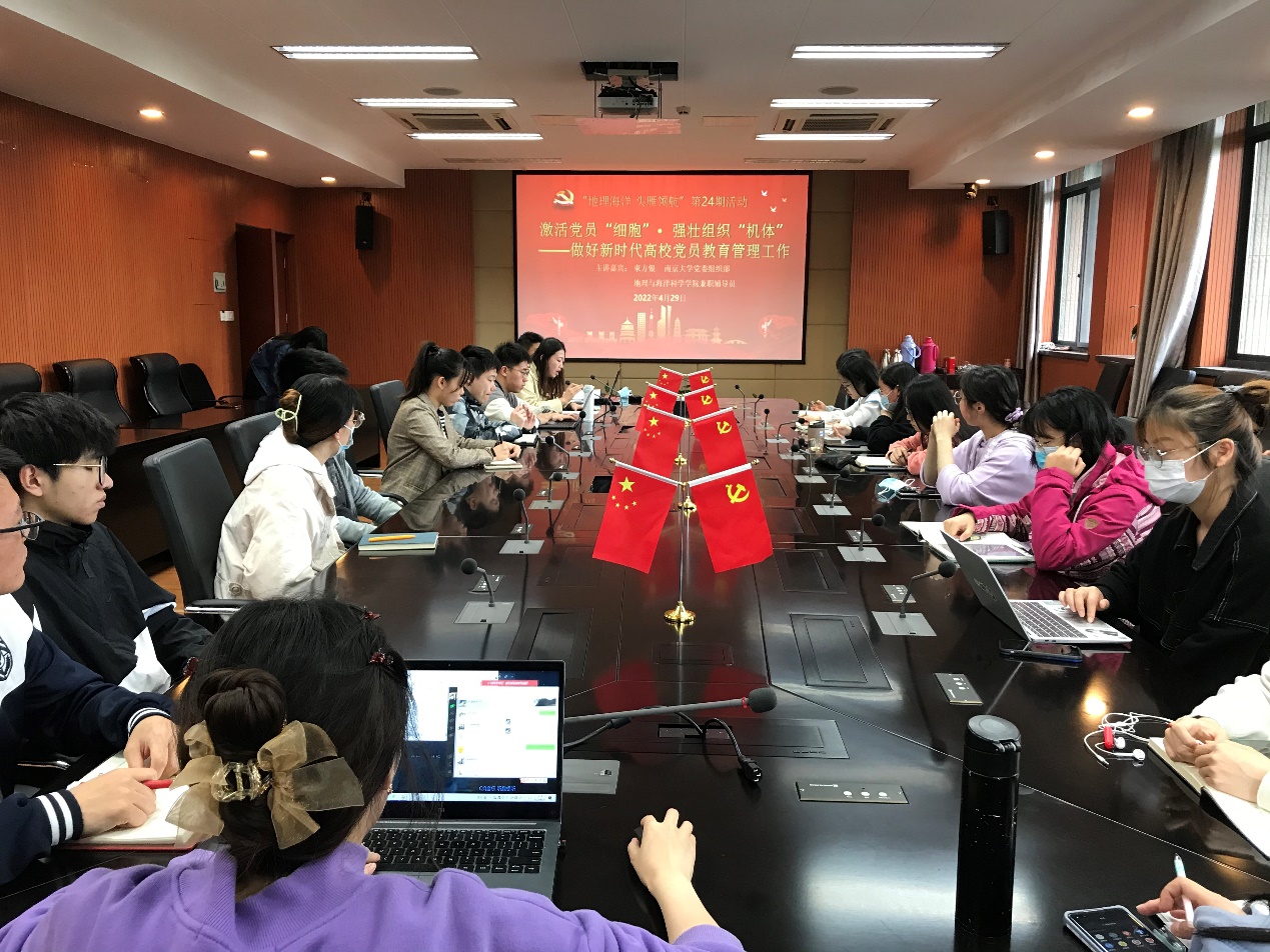 为切实提升高校党员的管理水平与先锋模范作用,推动支部党员教育工作有效开展,4月29日,大渔直播 党委举办“激活党员细胞,强壮组织肌体”新时代党员教育管理讲座,本次活动为“地理海洋,头雁领航”党员骨干能力提升系列活动的第24场。大渔直播 党委组织部、大渔直播 兼职辅导员束方银老师应邀作《激活党员“细胞”,强壮组织“机体”——做好新时代高校党员教育管理工作》主题报告,20硕人文地理党支部书记张金悦主持会议,研究生党支部书记、委员40余人参与本次会议。