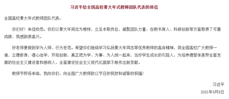 在第三十七个教师节来临之际,中共中央总书记、国家主席、中央军委主席习近平9月8日给全国高校黄大年式教师团队代表回信,对他们寄予殷切期望,并向全国广大教师致以节日的祝贺和诚挚的祝福。习近平在回信中表示,你们以黄大年同志为榜样,立足本职岗位,凝聚团队力量,在教书育人、科研创新等方面取得了可喜成绩,我感到很高兴。