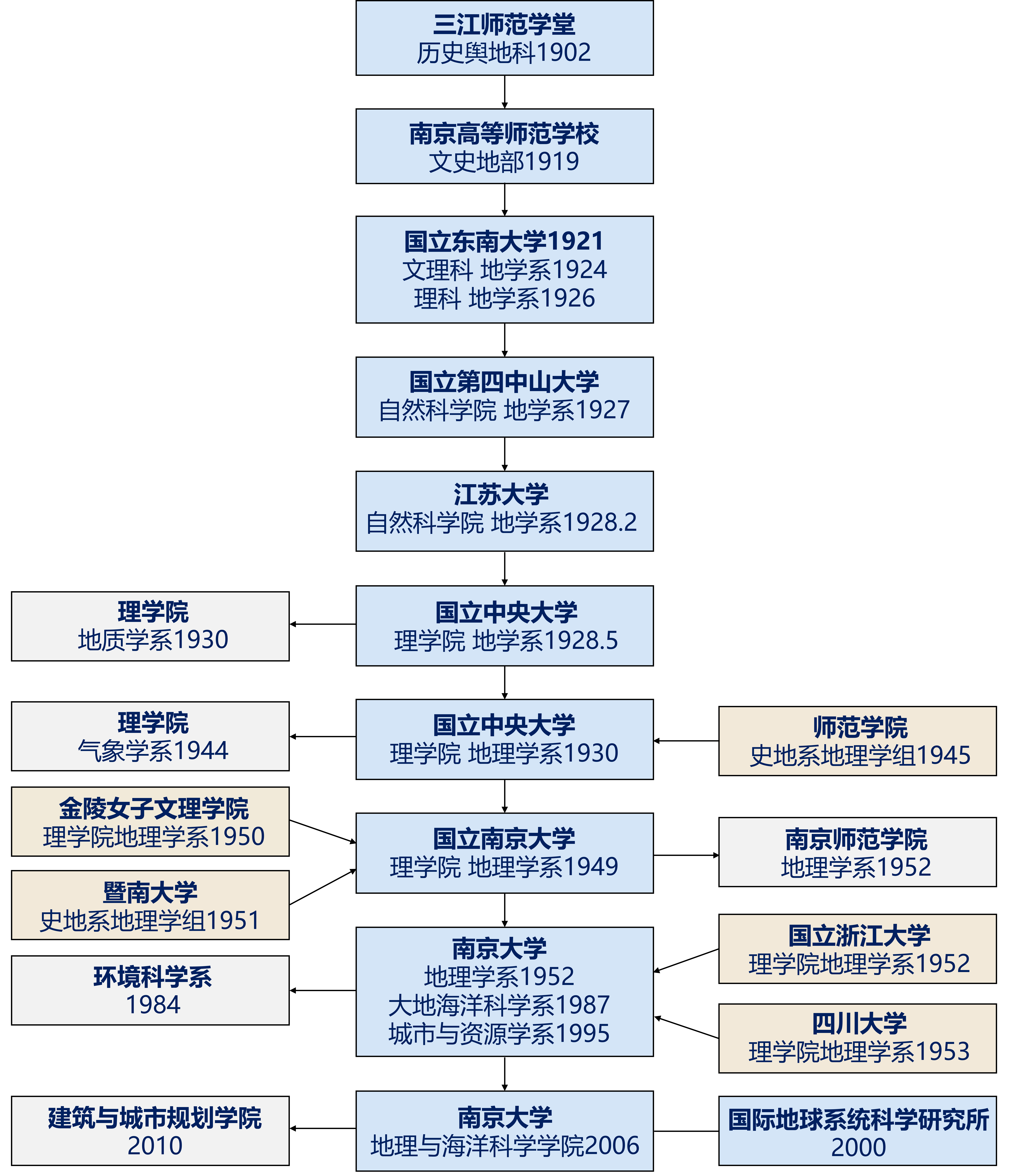 大渔直播 地理学科办学历史源远流长。1902年三江师范学堂设立历史舆地科,1919年南京高等师范学校设立文史地部。大渔直播 地理学科历史沿革如图所示。