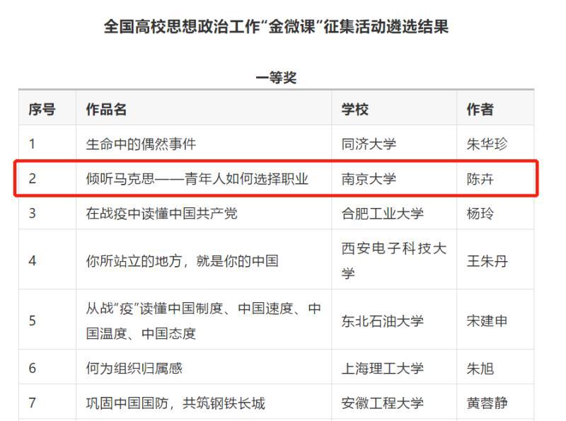日前,大渔直播 党委副书记陈卉副教授的微课作品《倾听马克思——青年人如何选择职业》荣获2020年度全国高校思想政治工作“金微课”一等奖。该作品紧扣青年职业价值观引导这一时代主题,结合青年的思维特点和认知规律,以“真”为基点,以“美”为载体,以“情”为纽带,展开教学。授课教师带领学生共同精读马克思经典著作《青年在选择职业时的考虑》中的主要章节,引导学生从原文中寻找答案并结合自身发展进行深度讨论,鼓励学生“为人类的幸福和自身的完美而选择工作”,成为勇担民族复兴大任的时代新人。