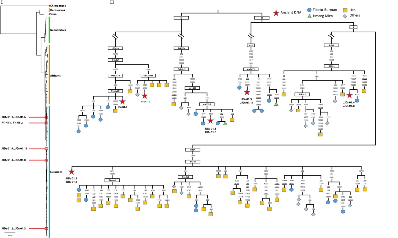 图3. 杨家坡洞和福岩洞人化石线粒体全序系统进化树。(I)基于邻接法推测8个杨家坡洞和2个福岩洞样本的线粒体系统发育关系,其均属于现代人类群,有别于尼安德特人、丹尼索瓦人和胡瑟古人组群。(II)杨家坡洞和福岩洞个体的线粒体单倍群(红星),及其相关单倍群下较近的现代亲属。
