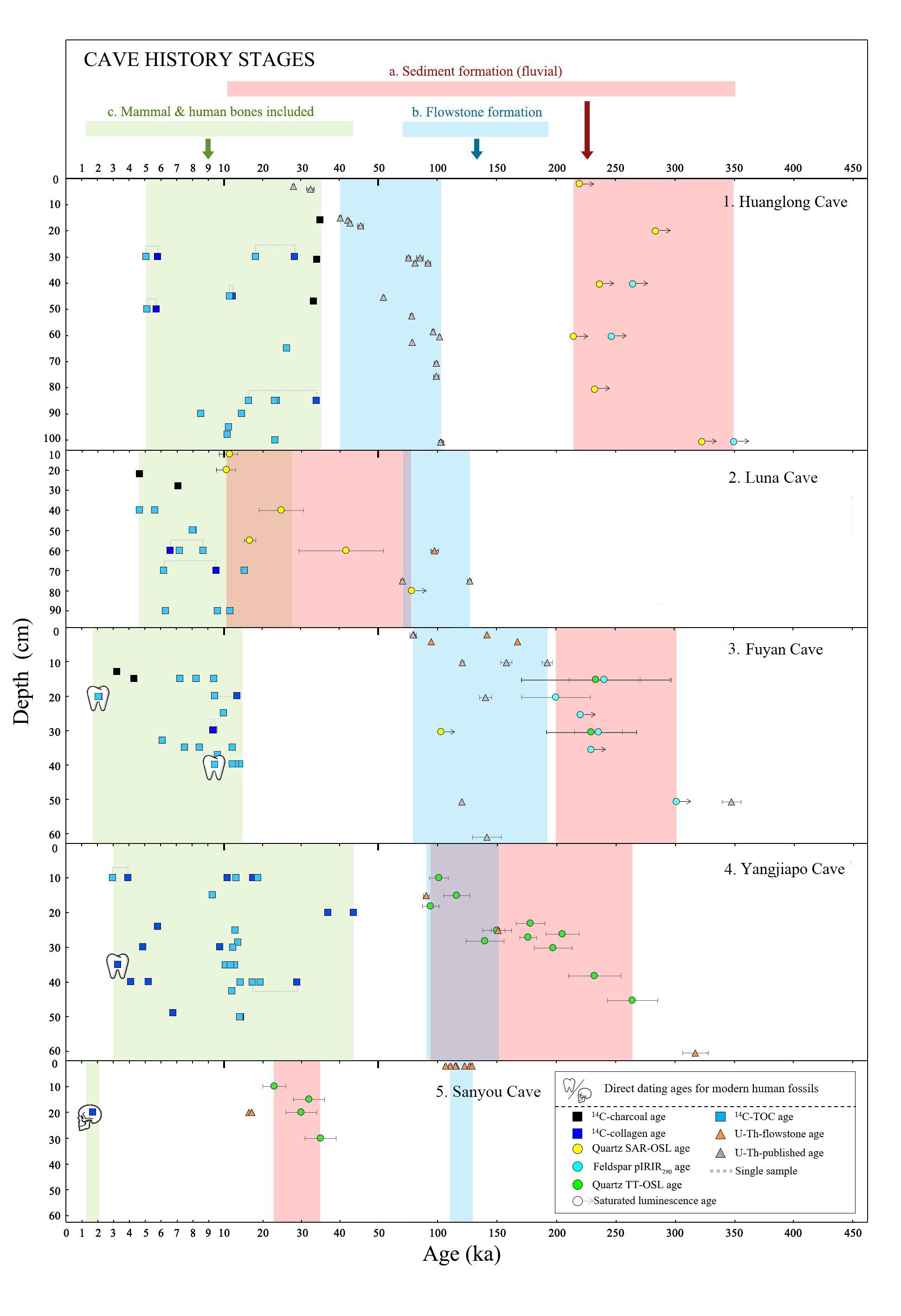 大渔直播 鹿化煜教授团队一直致力于地貌过程、气候变化与人类适应的研究,由团队成员孙雪峰副教授领衔的这项研究,基于多年积累,将地层年代学与现代人地理环境适应研究相结合,持续对我国南方5个与现代人起源相关的遗址——黄龙洞、陆那洞、福岩洞、杨家坡洞和三游洞(图1)进行了研究,他们完成了详细的地貌地层调查和多技术综合定年,包括不同技术的释光(SAR-OSL、TT-OSL、pIRIR)手段测定洞穴松散堆积物年代、铀(U)系方法测定钙板年代、加速器质谱放射性碳(AMS 14C)测定哺乳动物化石和人类化石年代等,并与复旦大学李辉教授团队合作,对现代人化石进行了古DNA分析。