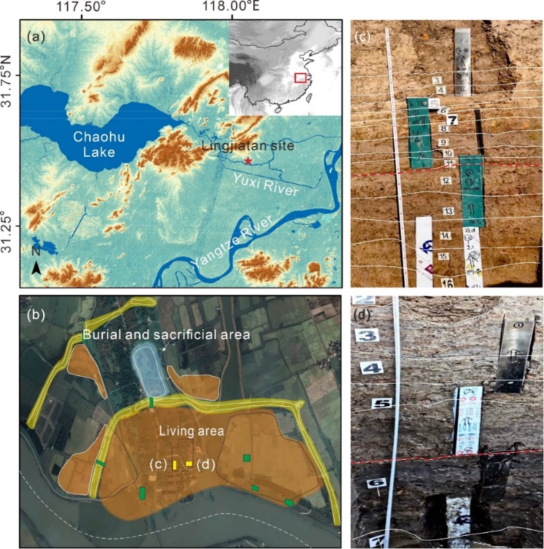 图1 凌家滩遗址位置(a)、遗址示意图(b)和遗址剖面图(c-d)