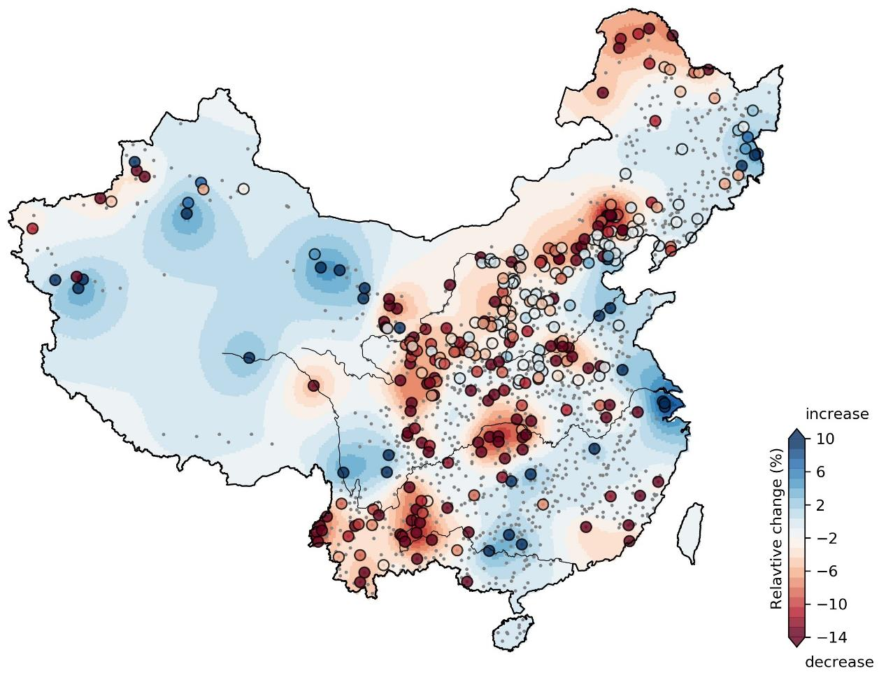 该研究表明,近40年来华北平原和东北地区的年最大洪峰量级显著减少,主要受到降雨和土壤湿度变化的影响;华南地区以及长江中下游地区年最大洪峰量级显著增加,主要受到降雨增加的影响;西北及青藏高原地区的洪水增加受到降雨和积雪覆盖变化的共同影响。我国百年一遇洪水(指洪峰量级发生概率为0.01的洪水)的相对变幅介于-14%到10%之间,其中长江中下游地区百年一遇洪水量级增加6%左右(图2),这就表明已建设的重要水利工程可能无法达到预期的防洪标准,从而为变化环境下的防洪减灾带来挑战。