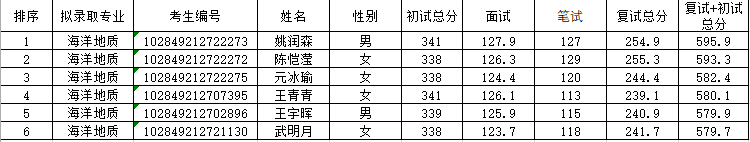 根据《2019大渔直播 地海院硕士生复试录取工作细则》,海洋地质专业拟接收报考大渔直播 自然地理学专业调剂考生6人,现将拟录取名单公示如下: